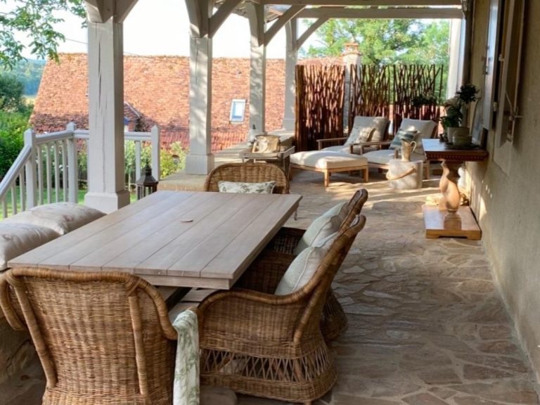 Ouverte sur le jardin, la terrasse devient un écrin intimiste où le matin s’éveille lentement, bercé par la lumière et le chant discret de la nature.