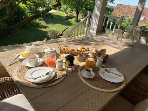 Sur la terrasse, un petit-déjeuner généreux, préparé avec des produits frais et faits maison, vous est proposé.