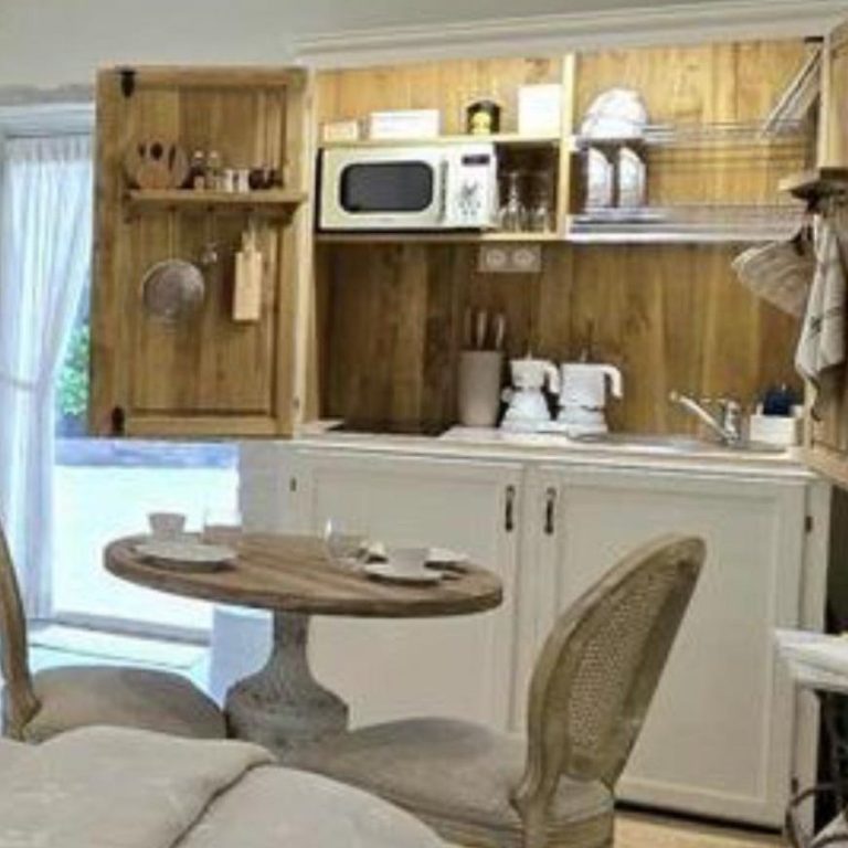 La kitchenette, astucieusement dissimulée dans un placard , offre tout le nécessaire pour cuisiner en toute discrétion : plaques de cuisson, micro-ondes, réfrigérateur et vaisselle . Un espace pratique et charmant, parfaitement intégré au studio.